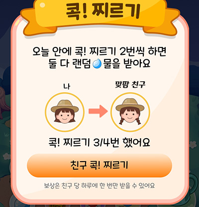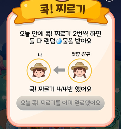 올팜 맞팜 친구와 서로 콕 찌르기 두 번씩하고 총 네 번을 찌르기 성공하면, 친구와 함께 둘 다 물 보상 받을 수 있는 콕!찌르기 이용 방법입니다.