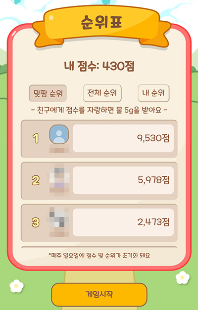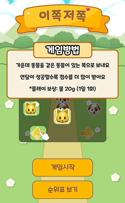 이쪽저쪽으로 맞팜 친구들과 게임하고, 점수 높으면 내 순위를 자랑하고 물을 추가로 획득할 수 있는 게임입니다.