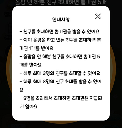 이미 올팜을 하고 있는 친구를 초대하면 뽑기권 1개 받는다는 내용입니다.