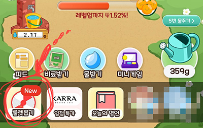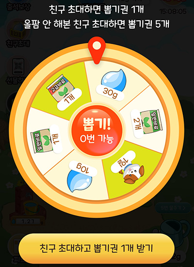 뽑기권으로 고급비료, 일반비료, 물, 바둑이 중에서 받을 수 있고, 뽑기권은 하루 최대 3개까지 받을 수 있다고 합니다.
