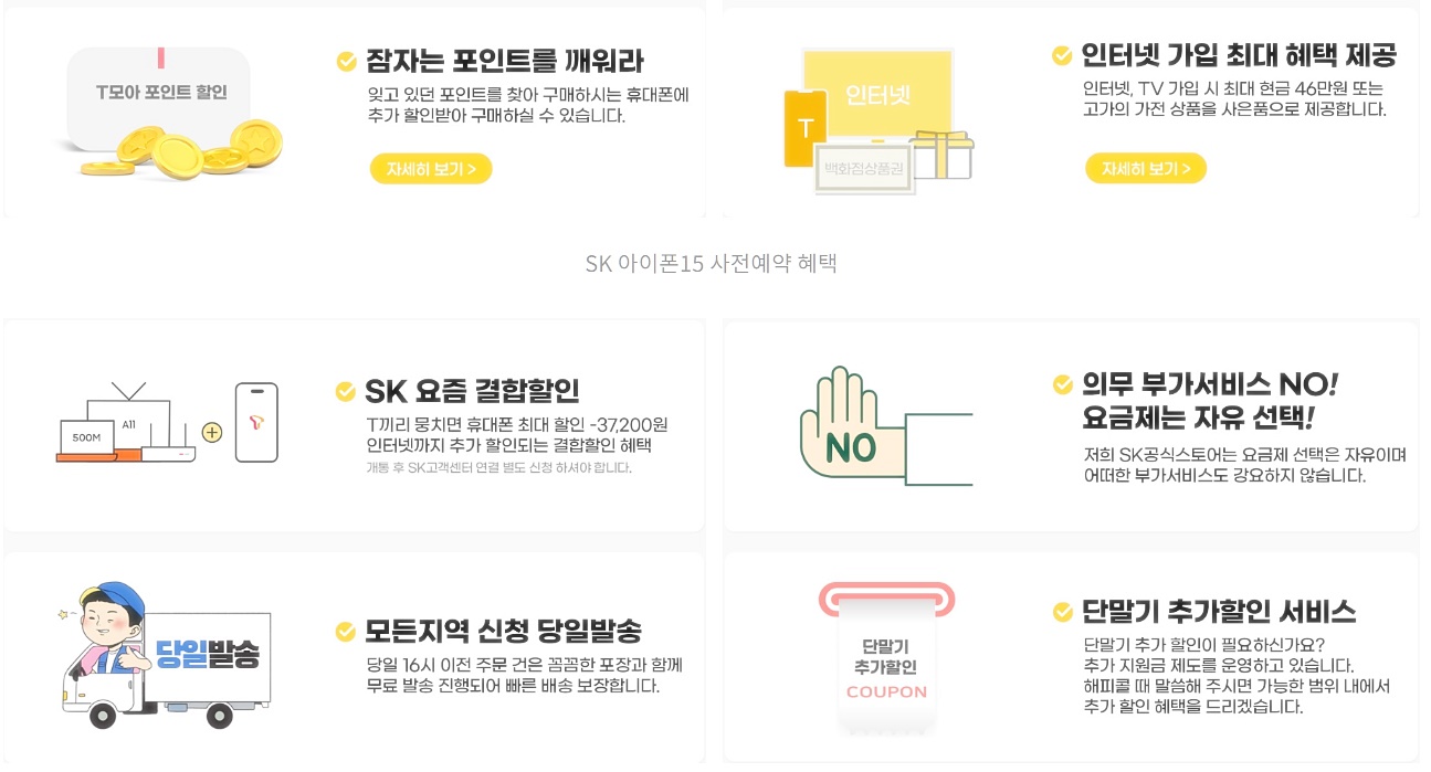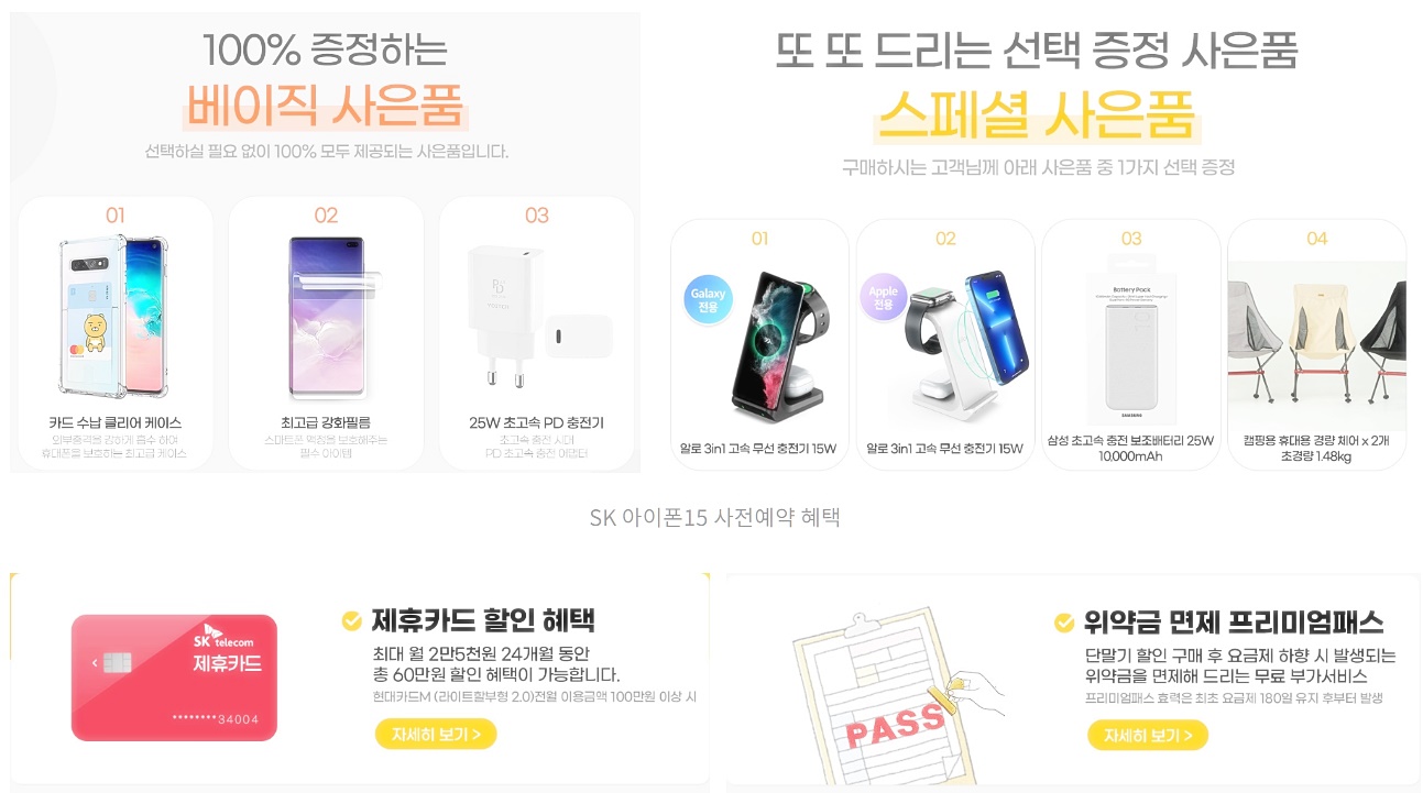 SKT, 믿음직한 통신사! 이번 아이폰15 사전예약 혜택도 풍성하답니다. 특히 SKT는 본사로부터 최대한의 물량 확보로 빠른 출고가 기대됩니다. 사은품이 마음에 들지 않는다면 해피콜을 통해 다른 혜택으로 변경할 수 있다고 하니, 고객 만족에 신경을 쓰는 SKT 통신사의 배려가 돋보입니다.
